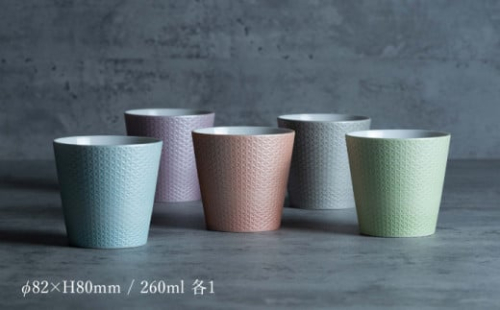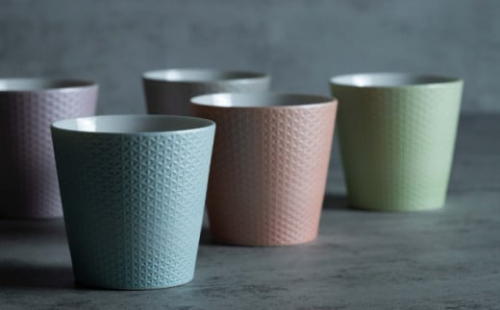 mint. 麻の葉 カップ (ブルー・ピンク・グリーン・アプリコット・シルバー) 5個セットです。 mint.シリーズは、400年もの間守ってきた伝統・技術と進化によってできた有田焼といえます。現代の技術できめ細かな麻の葉彫りを施し、熟練の上絵職人が丁寧に手描きしたカップです。その佇まいは、愛らしく上品で、それでいて実用的。カップの軽さや彫りの美しさを、ぜひ体感していただきたい「シンプルモダンな和のうつわ」です。 窯元:有限会社 金照堂 提供:有限会社 金照堂