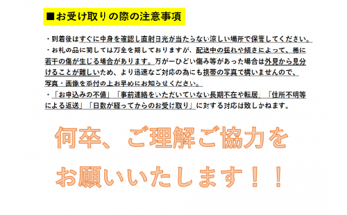 提供元の都合などにより、掲載中に予告なく返礼品の仕様(規格、容量、パッケージ、原材料など)が変更される場合がございます。お届けした返礼品のパッケージやラベルに記載されている注意書きなどをご確認ください。
