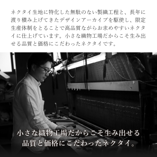小さな織物工場だからこそ生み出せる品質と価格にこだわったネクタイです。