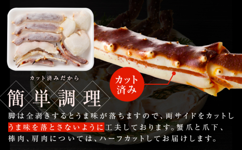 大型の生タラバ蟹を、食べやすいように丁寧にカットしてお届けします。脚はうま味を逃さないよう、両サイドだけをカット。蟹爪・爪下・棒肉・肩肉はそれぞれハーフカットに仕上げ、手間をかけずに贅沢な味わいをそのまま楽しめます。
