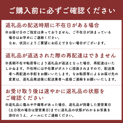※ご不在等により、返礼品を受け取れなかった場合の再出荷は致しかねます。