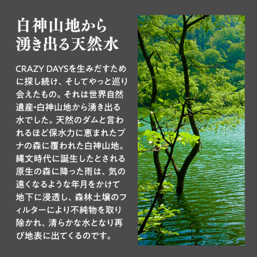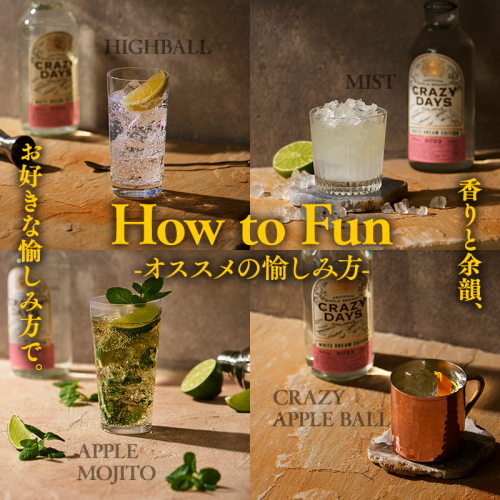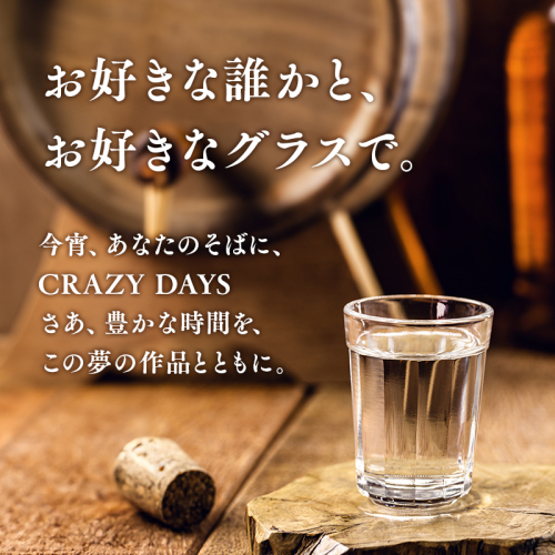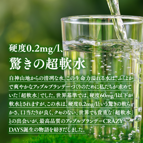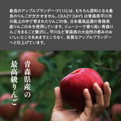 青森県でも有数のりんごの名産地である平川市から、premium apple brandy「CRAZY DAYS」が誕生。 青森県りんごと世界遺産・白神山地から湧き出る超軟水、そして酵母のみで仕込まれた、まさに大自然からの贈り物。 長時間熟成されていないため透明な色合いで、フルーティで爽やかなりんごのアロマと若々しくシャープな余韻が特長のブランデーです。