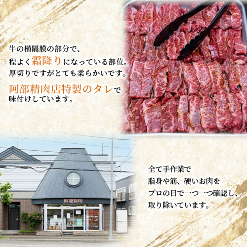 牛の横隔膜の部分で、厚切りにしてありますが肉質がとてもやわらかく適度な脂を含みます。当店特製のタレで味付けしております。