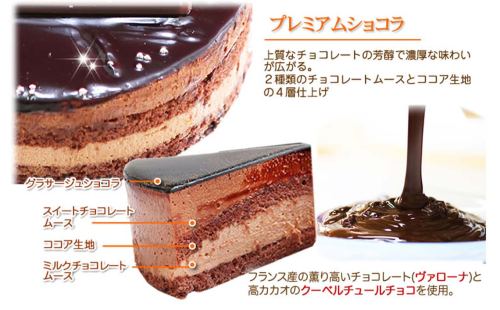 ・プレミアムショコラ:高カカオのクーベルチュールチョコを贅沢に使ったリッチ感あるチョコレートケーキ。スイートとミルクのとろけるチョコムースが絶品です。