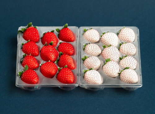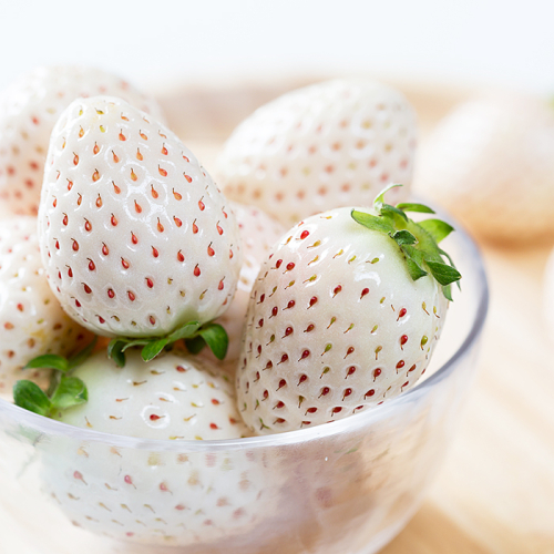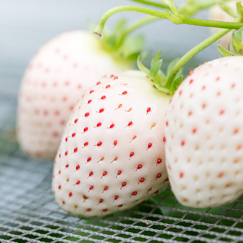 一般的な赤いいちごに比べて酸味が少なくほのかに香る甘い匂い、甘く上品な後味、果肉も白く粒だけが赤いのも特徴です。