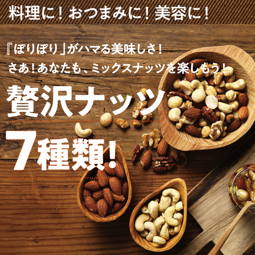 無添加:アーモンド、クルミ、カシューナッツ、マカデミアナッツ、ピーカンナッツ、ヘーゼルナッツ、ピスタチオの無添加7種類のナッツを贅沢に詰め込みました。