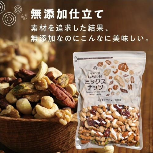 インターネット通販で人気のタマチャンショップは、宮崎県都城市発の自然食品屋です。 ななつのしあわせミックスナッツから、無添加と塩仕立てをセットでお届けします♪ 無添加:アーモンド、クルミ、カシューナッツ、マカデミアナッツ、ピーカンナッツ、ヘーゼルナッツ、ピスタチオの無添加7種類のナッツを贅沢に詰め込みました。 塩仕立て:季節ごとに異なる塩を使用した塩仕立てのナッツです。 「貴族の美容食」「天然のサプリメント」と称されるほど、世界で認められている「ナッツ」! 毎日のおやつ、おつまみ・サラダ等料理のアレンジに、ナッツを取り入れてみませんか?