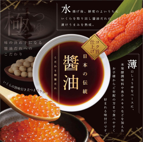 水揚げ後、鮮度のよいうちにいくらを取り出し醤油だれに漬けうまみを熟成させました。
