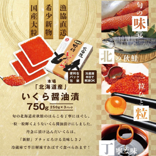 秋鮭卵(北海道産)、醤油、米発酵調味料、植物蛋白加水分解物、還元水飴、味醂、魚介エキス/調味料(アミノ酸等)(一部に小麦・大豆・サバを含む)