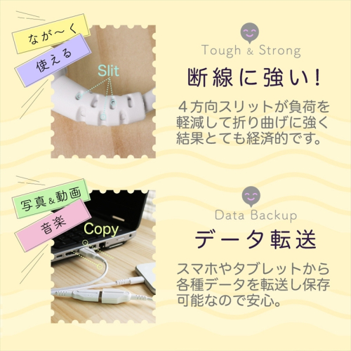 USB Type-Aコネクターのケーブルを2m延長することができます。コネクターの付け根部分がロングブッシュ形状になっており、4方向スリットで負荷を分散させ、折り曲げによる断線を軽減します。高耐久設計なので長期間、安心してお使いいただけます。安心の1年保証です