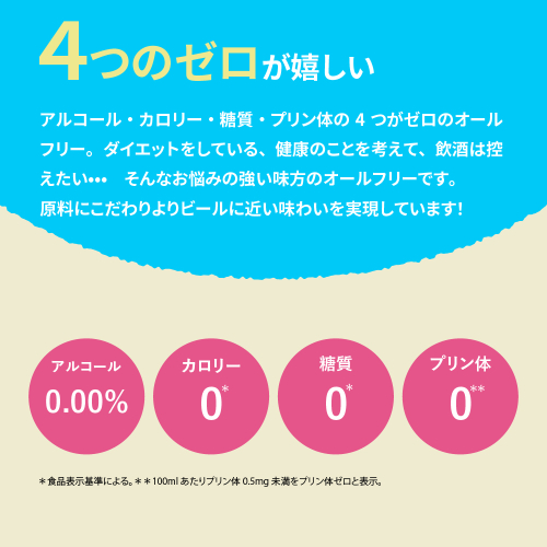 「アルコール度数0.00%」「カロリーゼロ※1」「糖質ゼロ※2」「プリン体ゼロ※3」の