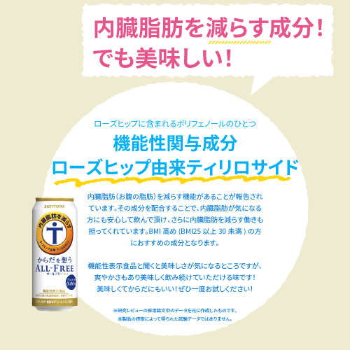 内臓脂肪を減らす機能があることが報告されている、ローズヒップ由来ティリロサイド※を加えました。また、粒選り麦芽100%一番麦汁使用、アロマホップ100%使用、天然水100%仕込といった「オールフリー」の原材料と製法へのこだわりはそのままに、苦味を強化することで飲みごたえが感じられる味わいに仕上げました。