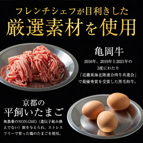 卵は自然の中で安全・安心を第一に育てられた平飼卵、亀岡産を中心とした玉ねぎ、無添加パン粉など厳選したこだわりの素材を使用しています。