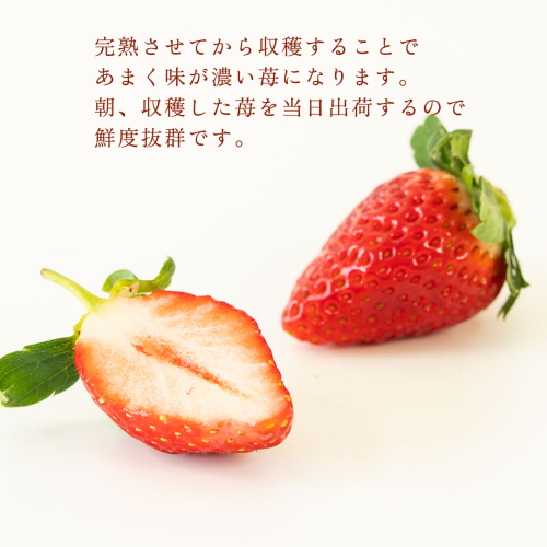 早摘みをせず、木生りでギリギリまで完熟させ、甘さを追及しました!直売メインの産地だからこそできる完熟いちごです。