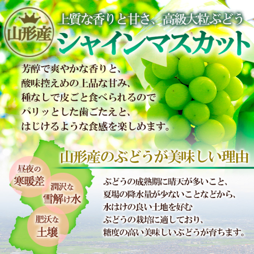 【山形連携中枢都市圏における共通返礼品です。関係市町(山形市、寒河江市、村山市、尾花沢市、山辺町、中山町、河北町、西川町、大石田町又は大江町)内で生産されたシャインマスカットをお届けします。】