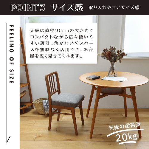 円形状のダイニングテーブルは直径90cmとコンパクトながら2~3名で使いやすい大きさ。