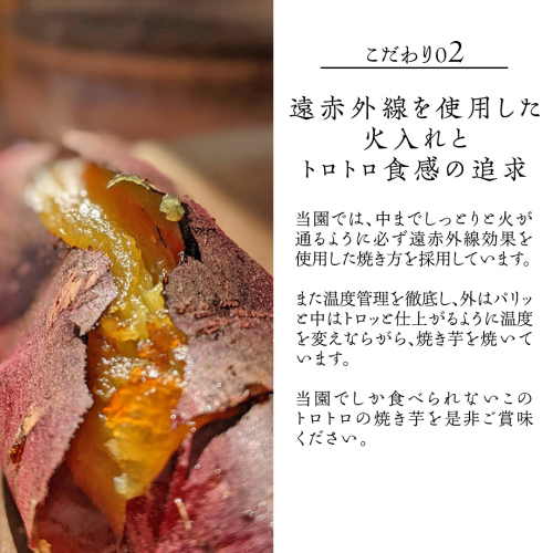 さつまいもは一気に火を入れるよりじっくり火を入れた方が甘く美味しくなります。それは、さつまいも自身が持つ酵素の働きによって、麦芽糖が生成されるからです。この麦芽糖が香ばしさのある甘みを生み出します。これはじっくり火を入れることでじわじわと生成されるものなので、温度の加減が重要です。登園では、中までしっとりと火が通るように必ず遠赤外線効果を使用した焼き方を採用しています。また温度管理を徹底し、外はパリッと中はトロッと仕上がるように温度を変えならがら、焼き芋を焼いています。