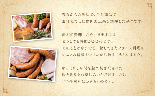 昔ながらの製法で、手仕事にてお仕立てした食肉加工品を燻製した品々です。
