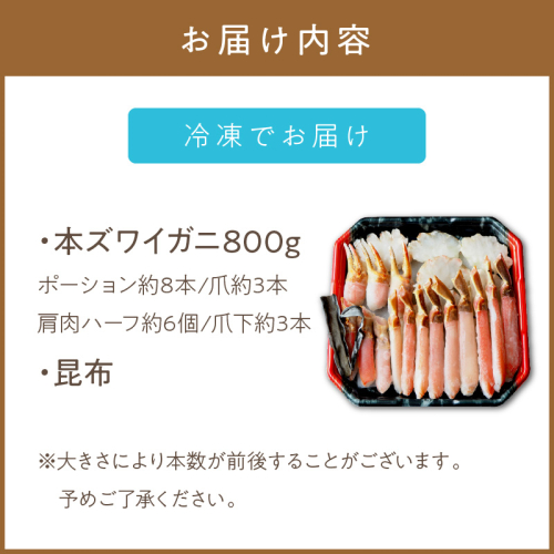 - 本ズワイガニ800g(ポーション約8本・肩肉ハーフ約6個・爪約3本・爪下約3本)、昆布
