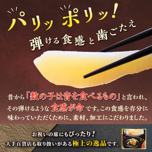 “数の子は音で食べるもの”と言われるように、パリパリッとした快い音と歯切れの良さが良質な数の子の証。