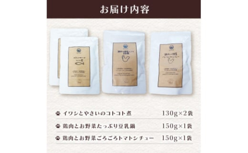無添加 ペットフード 3種類 (イワシ煮 豆乳鍋 トマトシチュー) 計4袋 犬 猫 ドッグフード キャットフード 安心 安全 ペット フード ペット用品 ヒューマングレード リッチフード いぬ ねこ 犬用 猫用 自然食材 魚 肉 野菜 やさい ごはん ご飯 餌 エサ わんこ にゃんこ 健康 健康食品 舞鶴市 京都府