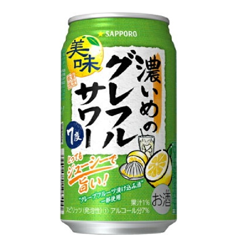 【説明】濃いめブランドの「サッポロ 濃いめのグレフルサワー」グレープフルーツ浸漬酒を一部使用し、ギュッと手搾りしたようなジューシーな果実感が味わえる、濃い味わいが特長です。アルコール分 7%