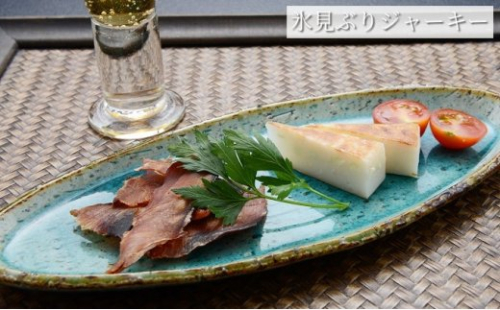 「氷見ぶりジャーキー」は塩と砂糖で水分を抜き、じっくり干しあげたことで凝縮されたブリの旨みがお手軽にお楽しみいただける一品です。噛めば噛むほどに風味が広がります。
