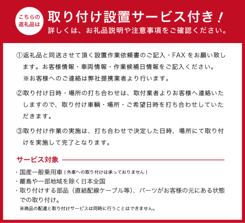 また、取り付けする部品(直結配線ケーブル等)、パーツがお客様の元にある状態での取り付けとなります。商品の配達と取り付けサービスは同時に行うことはできません。