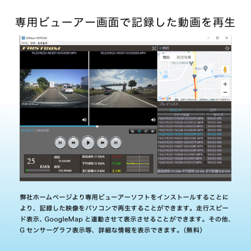 GPS搭載モデルで日時合わせを自動的に行うことができ、自車速度が表示されます。また速度超過警報・走行軌跡等の機能が使用できます。