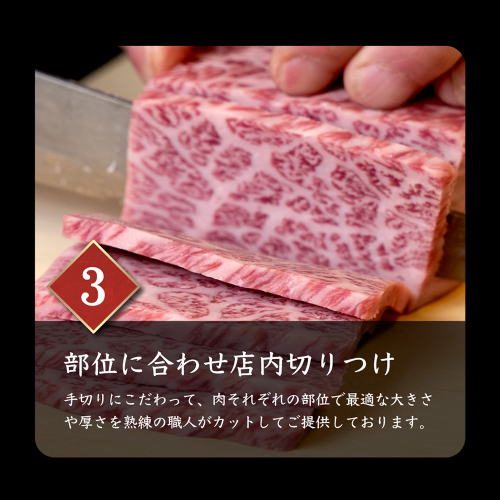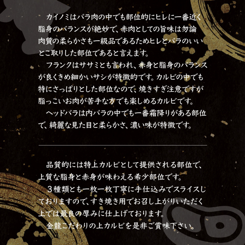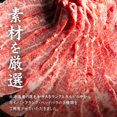 北海道産の黒毛和牛A5ランク上カルビの中からカイノミ・フランク・ヘッドバラの3種類をご用意させていただきました。