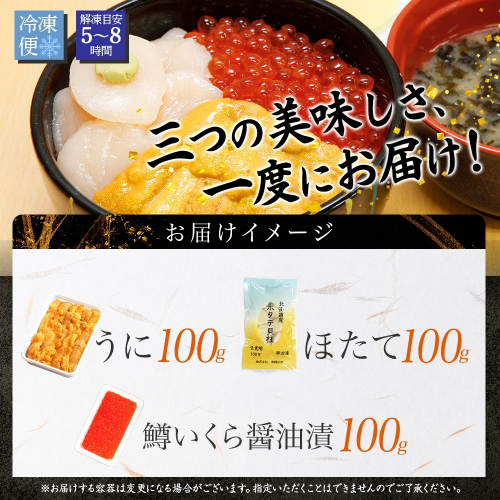 3429. うに チリ産 冷凍 100g 鱒いくら醤油漬け 100g ホタテ 100g セット ウニ 雲丹 いくら イクラ ますいくら ほたて 帆立 海鮮 海鮮丼 三色丼 送料無料 北海道 弟子屈町