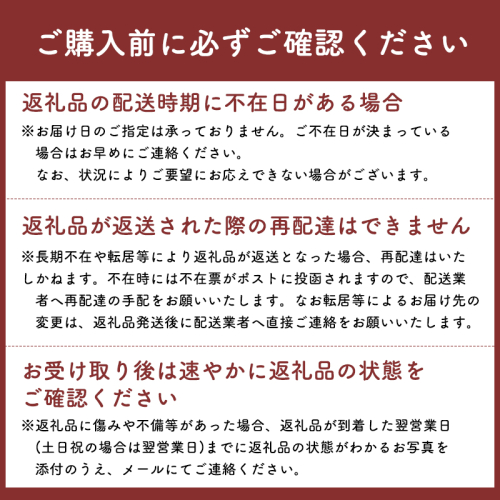 ※ご不在等により商品を受け取れなかった場合の再出荷は致しかねます。