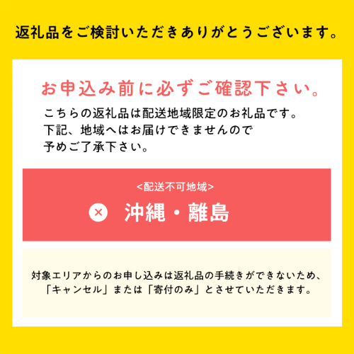※上記のエリアからの申し込みは返礼品の手配が出来ないため、「キャンセル」または「寄附のみ」とさせていただきます。予めご了承ください。
