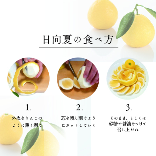 日向夏は皮を指でむいてはいけません。包丁でりんごをむくように黄色い皮を薄くをむき、ふわふわした白い内皮と果実を一緒に食べるのが正しい食べ方です。
