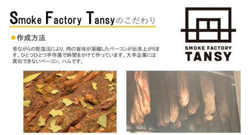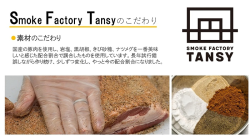 美味しい水と空気で育ったもち豚に海塩、黒胡椒、きび砂糖、ナツメグを混ぜ合わせ、5~6日間熟成させた後に6~8時間燻製したこだわりの一品です。