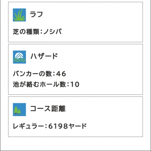JLPGAツアー2001年太平洋クラブレディースレーベンカップ開催。深い森の中に点在する池は10ホールに絡み、池に突き出すグリーンを狙う16番パー3や、フェアウェイがほとんどアイランド状態の18番パー4など美しい景色とスリルを両方味わえるホールが多いコースとなっています。