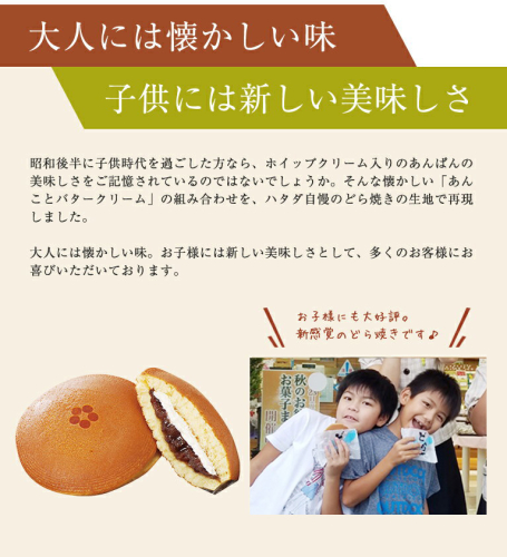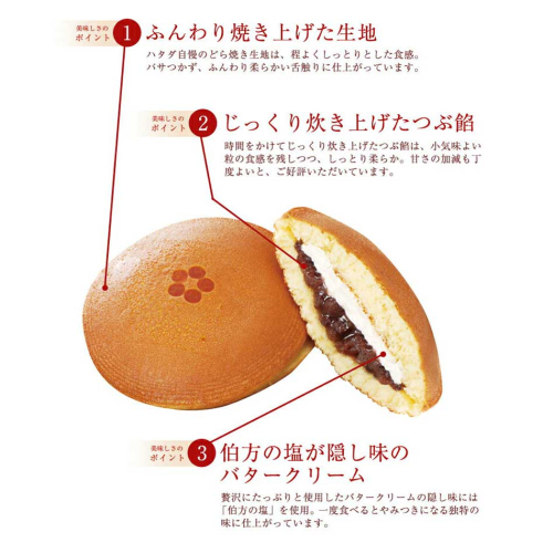 ふんわりと焼き上げたどら焼き生地で、しっとり柔らかく炊き上げた粒あんと伯方の塩がかくし味の塩バタークリームを挟み込みました。