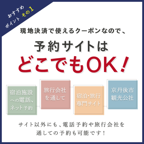 宿泊予約は、宿泊施設の直販(電話や自社サイト)、旅行会社、OTA、京丹後市観光公社など、どのような方法でも結構ですが、【現地精算の場合に限り】本クーポンをご利用いただけます。