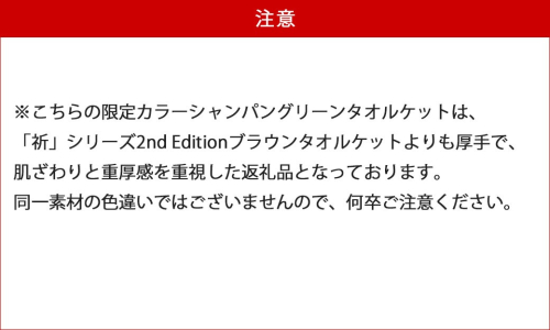 ※こちらの限定カラーシャンパングリーンタオルケットは、「祈」シリーズ2nd Editionブラウンタオルケットよりも厚手で、肌ざわりと重厚感を重視した返礼品となっております。同一素材の色違いではございませんので、何卒ご注意ください。