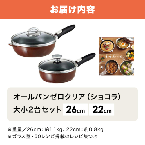 [ オールパンゼロクリア セット 22cm・26cm・ショコラ ] ガラス蓋・レシピ付き 取っ手が取れる フライパンセット 日本製 ガス・IH対応 調理器具 キッチン 日用品 アサヒ軽金属