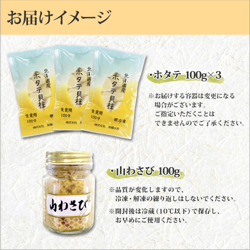 3367. ホタテ 貝柱 100g×3袋 計300g 山わさび醤油漬け 1瓶 ほたて ホタテ 帆立 小分け 玉冷 お刺身 薬味 辛味 調味料 ワサビ 山葵 ホースラディッシュ おかず おつまみ 送料無料 北海道 弟子屈町