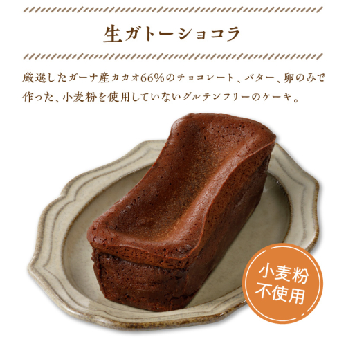 厳選したガーナ産カカオ66%のチョコレート、バター、卵のみで作った、小麦粉を使用していないグルテンフリーのケーキです。