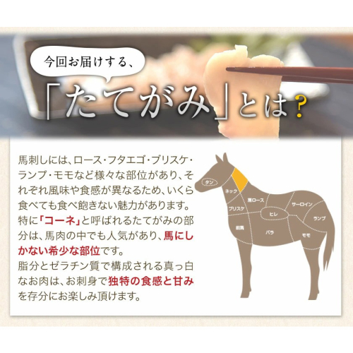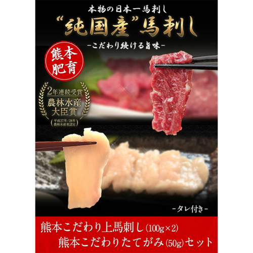 商品情報:熊本こだわり上馬刺したてがみセット 名称:生食用 冷凍馬刺し 産地:国産【熊本肥育】 内容量:上赤身馬刺し(100g×2セット) たてがみ(50g×1) 賞味期限:外枠に記載 保存方法:-18度以下で冷凍 配送方法:冷凍便でお届けします。 と畜場:熊本中央食肉センター 加工者:古閑牧場 熊本県熊本市東区長嶺南8丁目3-1 地場産品基準 告示第5条第8ハ号に適合 適合理由:熊本県 認定地域資源:馬肉(県内と畜)