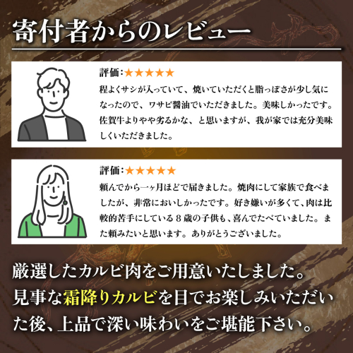 佐賀牛と同様、佐賀の肥沃な大地で育った銘柄牛です。 適度な霜降り、そして深く味わいのある赤身の美味しさをお楽しみください。 選りすぐったカルビ肉をご用意いたしました。 見事な霜降りカルビを目でお楽しみいただいた後、上品な深い味わいをご堪能下さい。 【地場産品に該当する理由】 佐賀県 認定地域資源:佐賀産和牛(告示第5条第8号ハ)