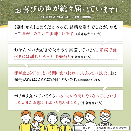 製造過程で欠けたり割れてしまったお煎餅をたくさん詰め込んだお得なセットとなっております。無選別に包装したお煎餅となりますが、味や品質に問題はございませんのでご安心くださいませ。 ザラメ、ねぎとろ、醤油、揚げ煎、おかきなど、沢山の種類から6つを選んでお届け致します。お友達と一緒に、ビールのおつまみに、食後お茶と一緒に、お子様のおやつに、どんな場面でもぴったりの様々なお味が楽しめるお煎餅のセットとなっております。 原材料の仕入れ状況や生産状況等により上記お礼品以外が入ることもございますのでご了承願います。 また、訳あり品のため種類の指定は出来ませんが、味・量ともにご満足頂けるお礼品をお届け出来ますよう心掛けてお届け致します。 【賞味期限】 製造日から90日 【アレルギー】 小麦、えび、大豆 【事業者】 手作処 かっぱ本舗