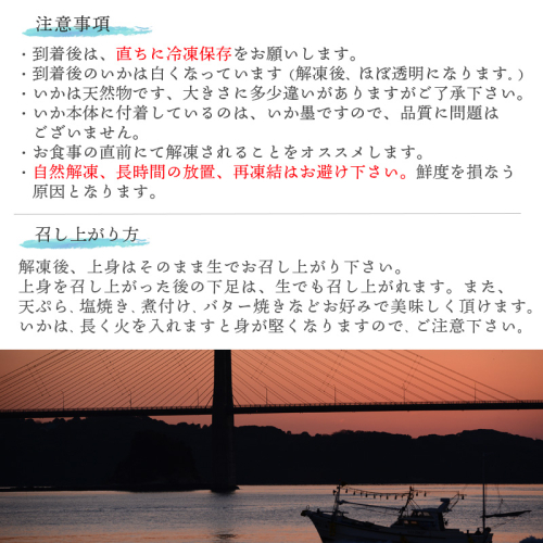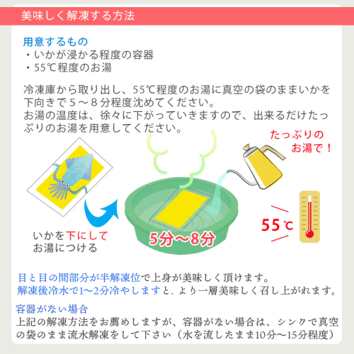 イカは溶けやすいため、到着後は直ぐに冷凍保存をして下さい。
