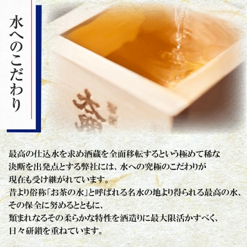 淡麗辛口の大吟醸酒、やや濃醇中口の特別純米酒、濃醇中口の純米酒と、