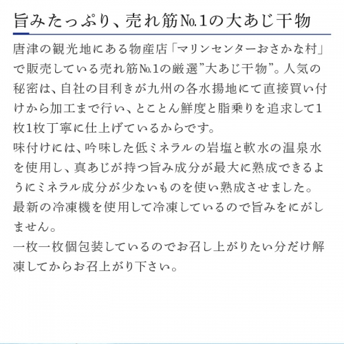 唐津の観光地にある物産店「マリンセンターおさかな村」で販売している売れ筋No.1の厳選”大あじ干物”。