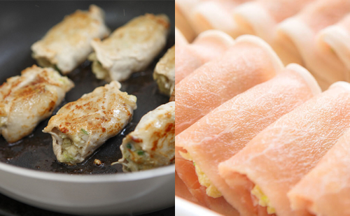 肉巻き餃子は、餃子の餡(具)を豚ロース肉で巻きました。大葉の風味で絶妙な味。ポン酢で頂けるので、女性にも人気で、ビールとの相性も抜群です!!
