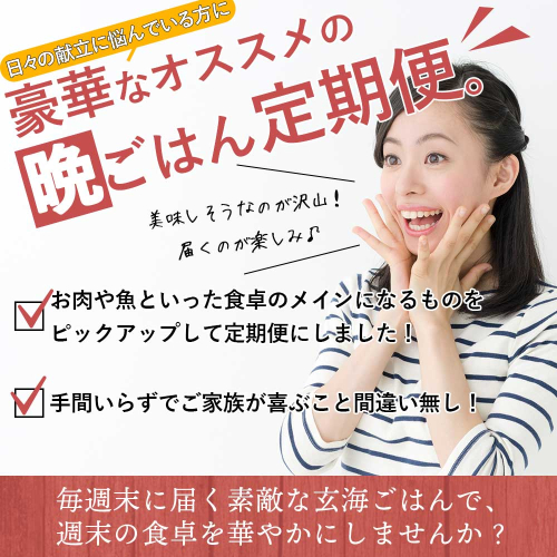 今日の晩ごはんなににしよう… そんな主婦のみなさまにお届けする今回の定期便。 毎週届く素敵な玄海ごはんで週末の食卓を華やかにしませんか? 手間いらずでご家族が喜ぶこと間違い無し^^ 決まった曜日にお礼の品が届くので日々の献立も立てやすいです。 お肉や魚といった食卓のメインになるものをピックアップして定期便にしました!